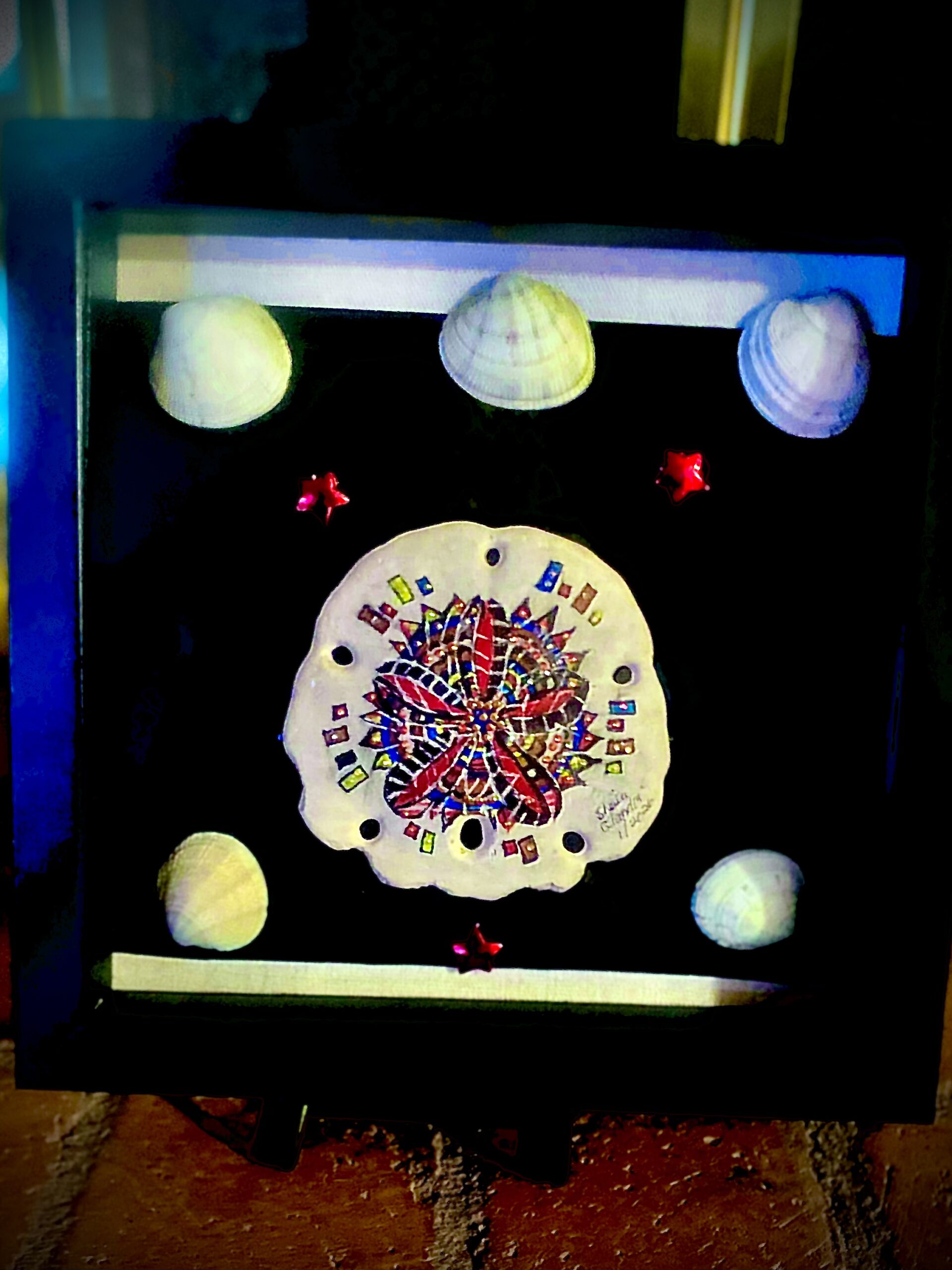 A striking exploration of symmetry and contrast. Midnight Mandala centers on a naturally harvested sand dollar transformed into a vibrant focal point. The central piece features an intricate hand painted mandala. The design utilizes a bold palette of Crismon and royal blue, with metallic gold echoing the complex geometry found in natures architecture.