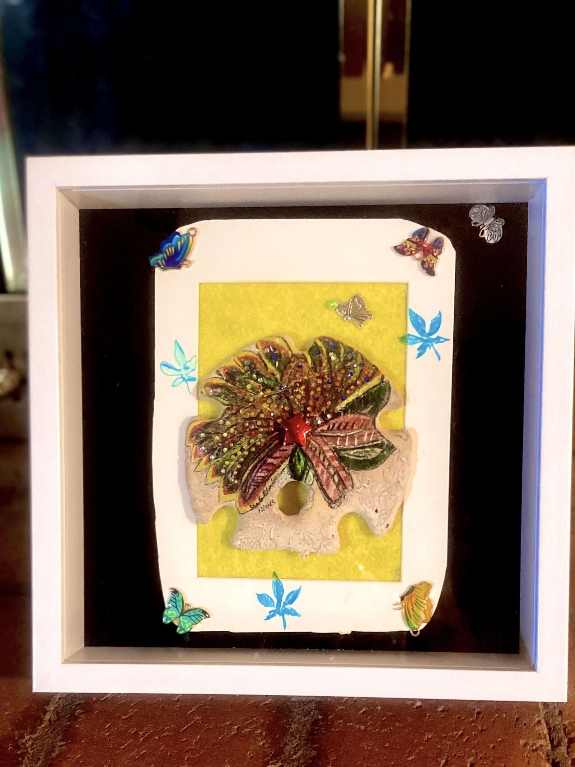 Simple and direct, focusing on the way the patterns spray out from the middle. It’s a celebration of radiating color and tactile layers. By combining the rugged texture of the sea with the delicate grace of garden wing, this piece captures a moment of joyful symmetry.